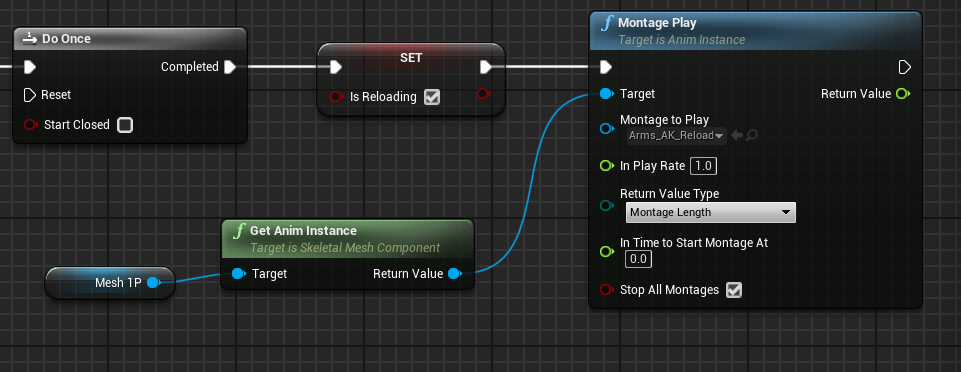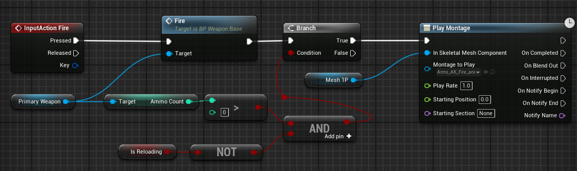 4. Now, if it's greater than zero, we'll play the arms shooting animation. Create montage node from true pin (drag to create). Mesh1P was chosen as the Skeletal Mesh Component (Mesh that will be animated). Let's also make sure that IsReloading isn't true by using the AND node.