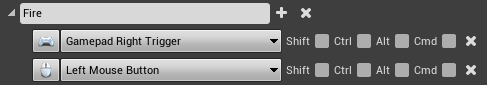 1. Open up FirstPersonCharacter. Create an Input Fire node in the Event Graph. These input events are created and edited in the project settings (Edit > Project settings > Input). We've added a left mouse button/Gamepad right trigger to our Fire event. As a result, whenever those buttons are pressed, this specific event will take place.