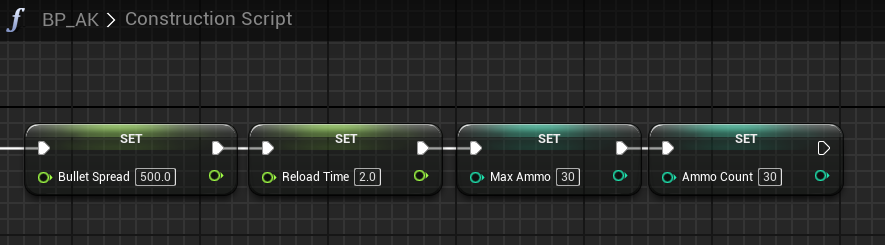 1. We added variables to our weapon base class in the previous lesson. Now, open your AK blueprint and in the construction script, drag and create nodes (set "variable name") and set those variables.