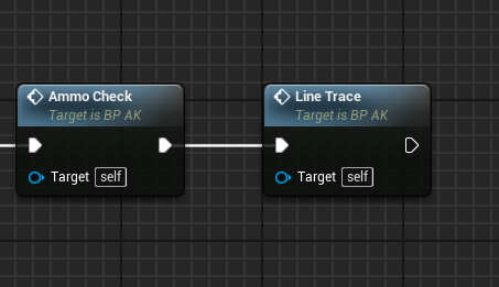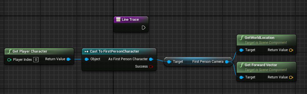 1. In your AK blueprint, create a new function called LineTrace. Lets copy our get character nodes from AmmoCheck function. Now, let's get his camera and determine its position and forward vector.
