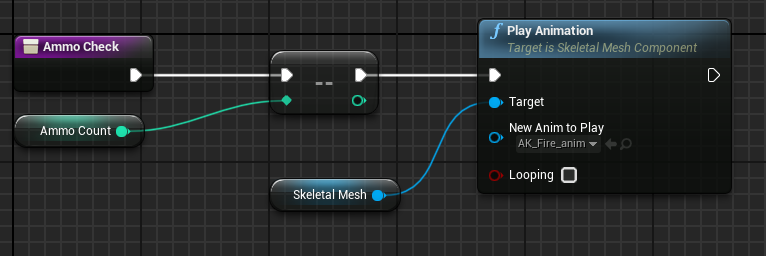 5. Let us decrement our ammoCount every time this function is called. We have a node for decrement (- -). After that, let's play our AK fire animation (we have our skeletal mesh in Components section).