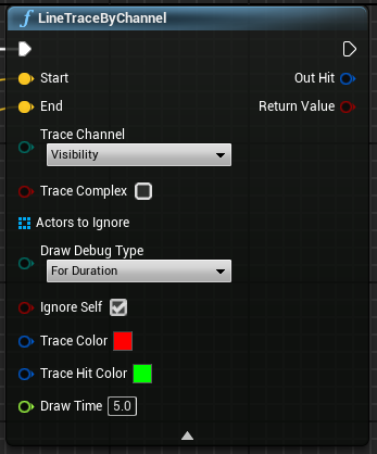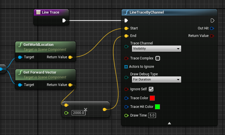 2. In UE4, we have a line tracing node (LineTraceByChannel), so let's create it and specify the start and end points (start - world location, end - forward vector). However, because we require a long line, we must first multiply our forward vector (for example 2000x line).