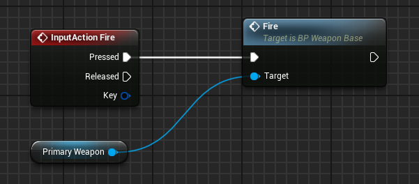 2. Now, whenever we click the left mouse button, we'll trigger our Fire event from our Primary Weapon. Drag your primary weapon variable and press the fire button.