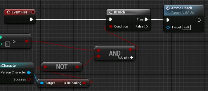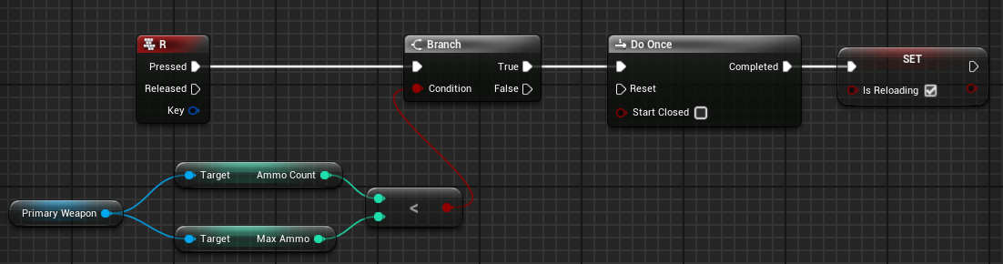 2. Now, launch your first-person character. Make a R key node. Now we need to see if our ammocount is less than our maximum ammocount, because we don't need to reload if we are full. If this condition is met, set is reloading to true only once.