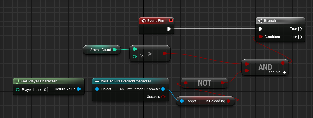 3. We must also obtain our IsReloading variable from the player in order to determine whether or not we are reloading. Add a node called get player character and cast it to FirstPersonCharacter. Convert a failed cast to a pure cast by right-clicking on it. Get the variable IsReloading now. Then, see if it's false AND the ammo count is greater than zero.