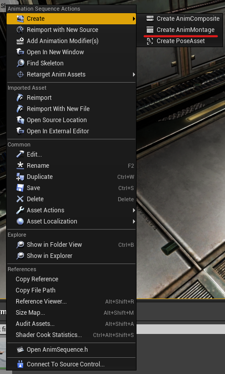 5. Let's make our montage now. Montage is an animation that can be played on top of another animation. For example, we'll play our idle animation repeatedly, and then the fire animation will play on top of that. Locate your Arms_AK_Fire_Animation, right-click, and select "create montage."