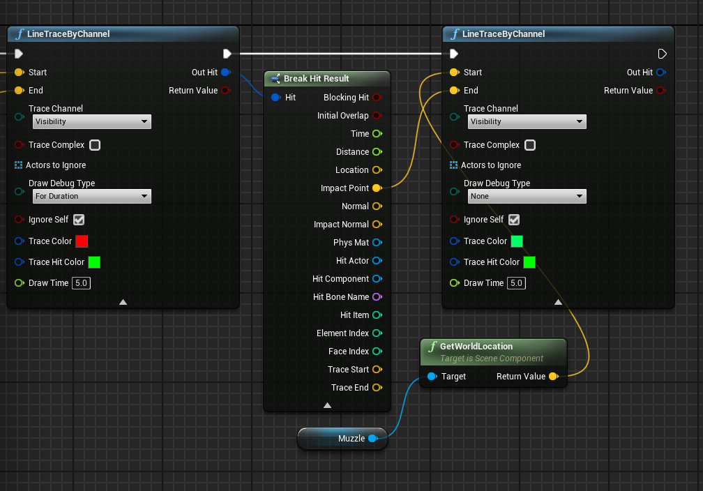 5. Let us now break down our Out hit and create a new Line trace. We'll use this to determine the impact point of the previous trace and use it as the end point for our muzzle. Create a break node from out hit, open it up, and connect the impact point to the new linetracebycahnnel node. Drag our muzzle to get its world location for the start location. Change the trace's color to better understand where it's coming from and compile.