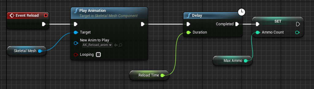 1. Create a reload event node in your AK blueprint Event Graph. Create a node to play the reload animation from there. After that, we'll add a delay to our reload time and set our ammocount to maxammo.