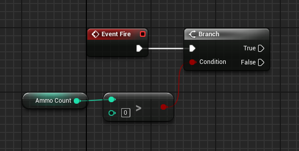 2. Let's add some firepower to our weapon. First, we must check for the Fire event, which we have already set up in our weapon base. Open Event Graph and add a node for the event Fire. Then we'll check (via the Branch node) for ammo, which must be greater than zero.