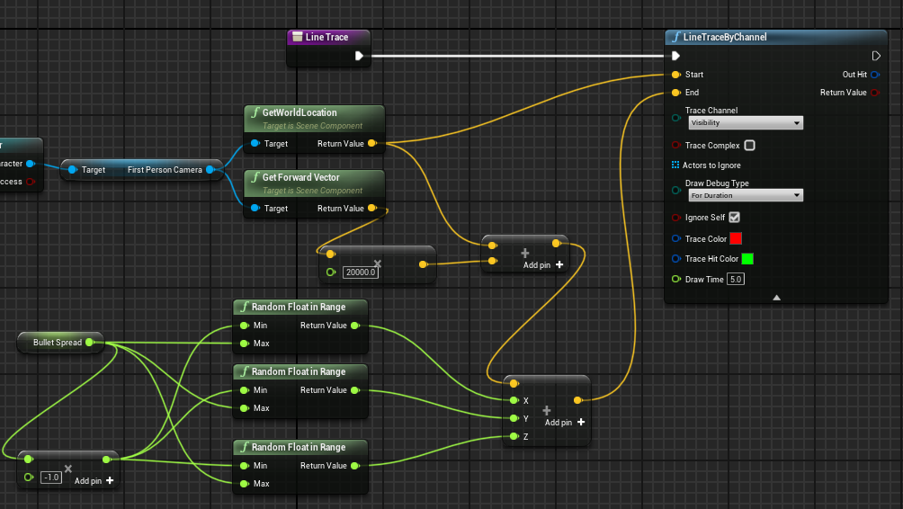 4. Let's make our bullets a little more spread-out. We need to increase the spread of our end vector, so we add modified vector. Take your bulletspread variable and multiply it by -1, then generate three randoms within the range (Set min to -1 value and max to bulletspread variable). Combine your camera's world location and forward vector. Then combine bulletspread and summed vector (for bullet spread right click on second vector add node and split struct). We did this so that each of the three vectors would be unique.