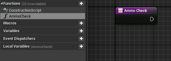 4. Now it's time to fire our gun. To begin, we must create a variable in our FirstPersonCharacter called IsReloading (Boolean). Let's add a new function to our AK blueprint and call it AmmoCheck (in my blueprint panel functions +). In this function, we'll decrement our bullets and play a fire animation.
