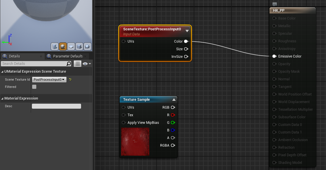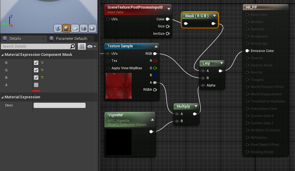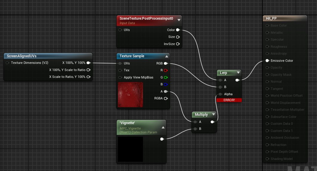 2. Open Hit material and change the material domain to post processing. Connect the SceneTexture node to the emissive color and use texture id as postproccesinginput0. Also, while holding T, create a texture node and select HitVignette.