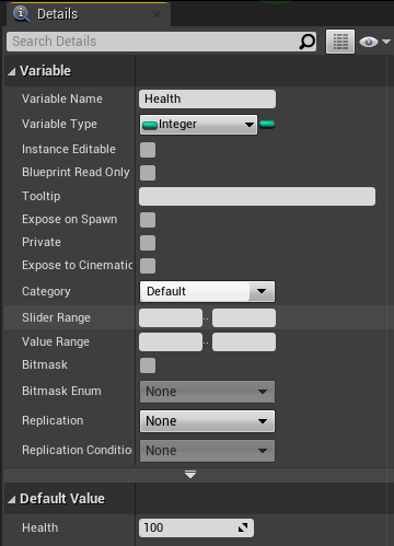 4. Let's quickly open our FirstPersonCharacter and add a Health variable (integer type) with a value of 100 to it (after compiling).