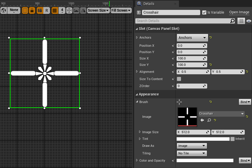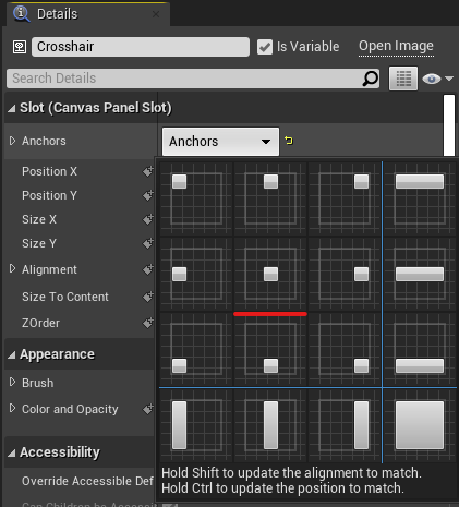 2. Place your widget and rename it Crosshair in the details panel. Then, in the Anchor dropdown menu, select Center Position. Set your widget's x and y coordinates to 0.