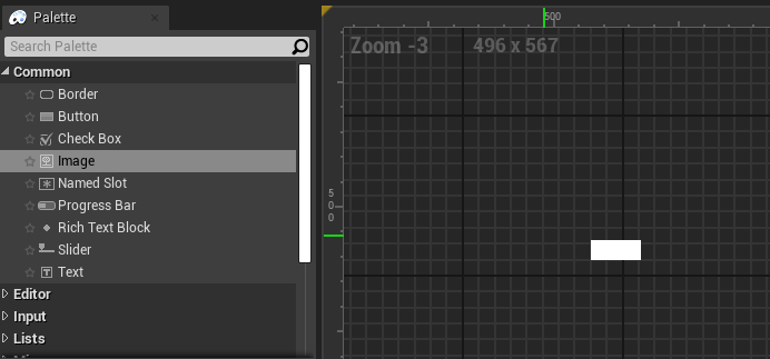 Create a Widget Blueprint by right-clicking in the content browser and selecting User Interface. Then launch the Widget editor. Drag and drop an image widget from the Palette.