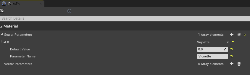 1. Let's start by making materials for our vignette. Call it Hit_PP and add MaterialParameterCollection to the materials & textures folder. Open it with the command MPC_Vignette. Under scalar parameters, press plus to add a new parameter called Vignette and save it.