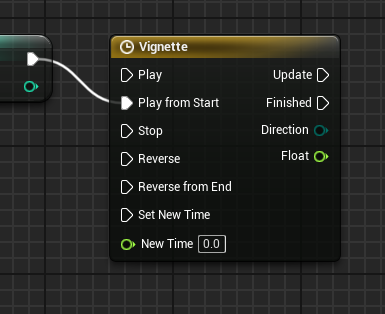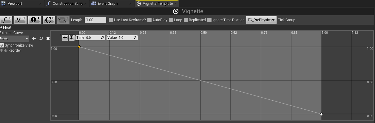 7. Now Add new timeline node and call it vignette, connect it to play from start. Open it up and add new float by pressing on F+ button (name it float). It will create graph where we can set different values by time. Add two keys by right clicking and choosing add key. Set first key time 0 and value 1 and second time 1 value 0. Set the overall length to 1.
