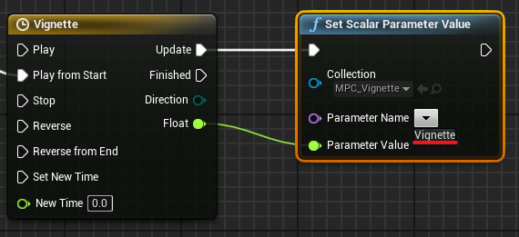 8. Create a SetScalarParameterValue node from the update output and select our MPC_Vignette value. Drag the float into the value of the parameter. As you can see, this timeline will change our vignette value from 1 to 0 in a single second, resulting in the damage taken effect.
