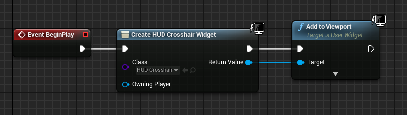 2. Open its Event graph and add a CreateWidget node from the start of play. Create an Add ToViewport node from the return value. Select our Crosshair blueprint, compile it, and save it.