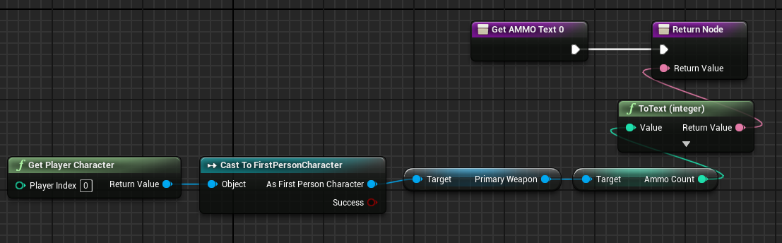 5. Let's now connect our ammo text to the ammocount variable. Click on the text, then click bind and create binding under content section > text. It will open a graph, and from there we must retrieve our character. Take the ammo from the character's primary weapon and place it in the return value.