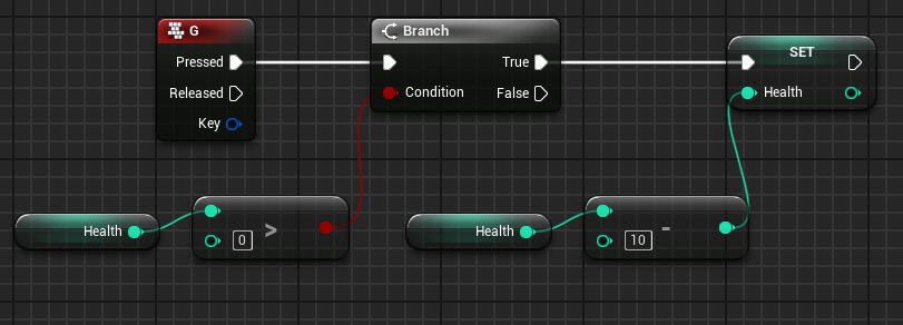 5. Lets create some kind of logic to see if it works. Open up FirstPersonCharacter and create G key event. Check if we have more than 0 health and decrement 10 from our health.