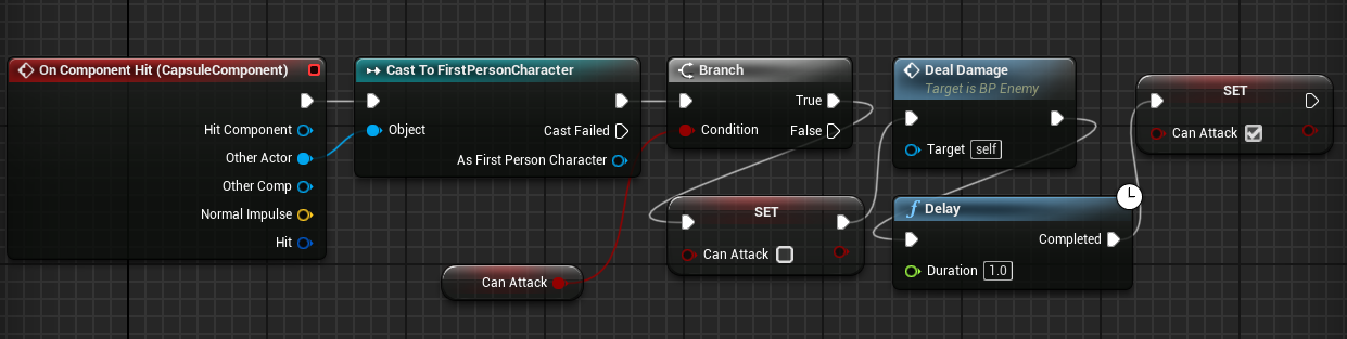5. Capsule collider has now been added to the Enemy Event Graph. Hit on a component. Call the deal damage function and cast to our first-person character. Check for the can attack variable as well. If it's ture, disable it and add a delay before re-enabling it.