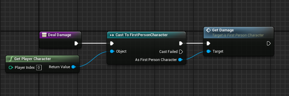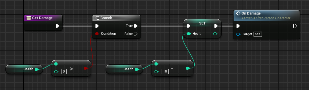 1. Create a new function called GetDamage in the first person character. Paste in all of our health logic except the timeline.