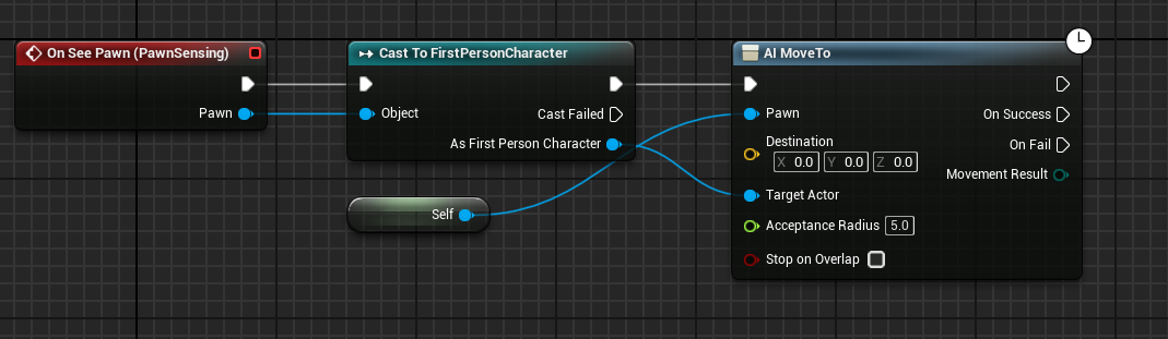 3. Open the Event Graph and select On See Pawn from the PawnSensing events. Then, for our FirstPersonCharacter, add AI Move to. Set target actor as our FirstPersonCharacter, and self as the pawn to be moved. Compile and save your work.