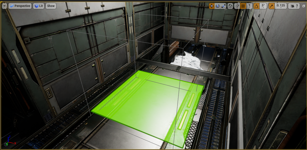 4. Find nav mesh bounds volume in the place actors tab and drag it to your level. This is the area within which all AI blueprints can move. Scale it and press P to see where your opponent can walk.