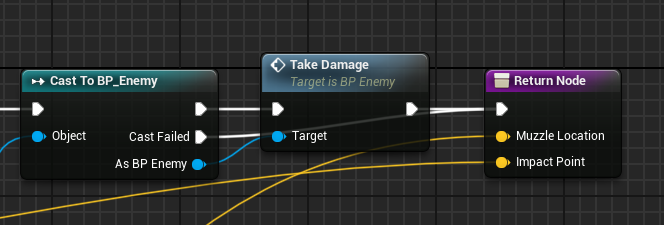 1. Navigate to the AK blueprint and select the Line Trace function. The last line trace resulted in a break hit. Now, cast a hit actor from the break result in BP_Enemy. If it hits an enemy, it will destroy it; however, if it does not, we still want to continue, so make your graph look like this.