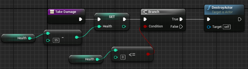 2. But we don't want to destroy our enemies so quickly. Let's create a function on our BP_Enemy called TakeDamage. Let's decrement enemy health by 35, for example, and see if it's less than or equal to 0. If this is true, then we will destroy our adversary.