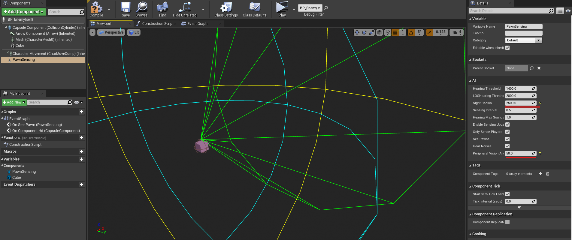 2. Add the PawnSensing component now. This is a pre-installed AI component. You can change the AI's vision angle and other settings in the AI section. Set it to whatever you want. You can also change the speed of the character in the character movement component if the enemy is too fast.