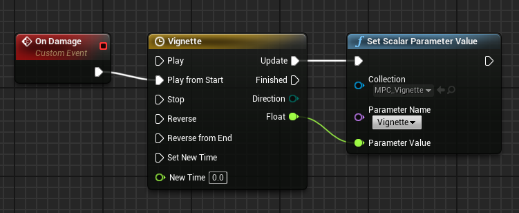 2. In the event graph create new event called On Damage and connect it to your vignette timeline.