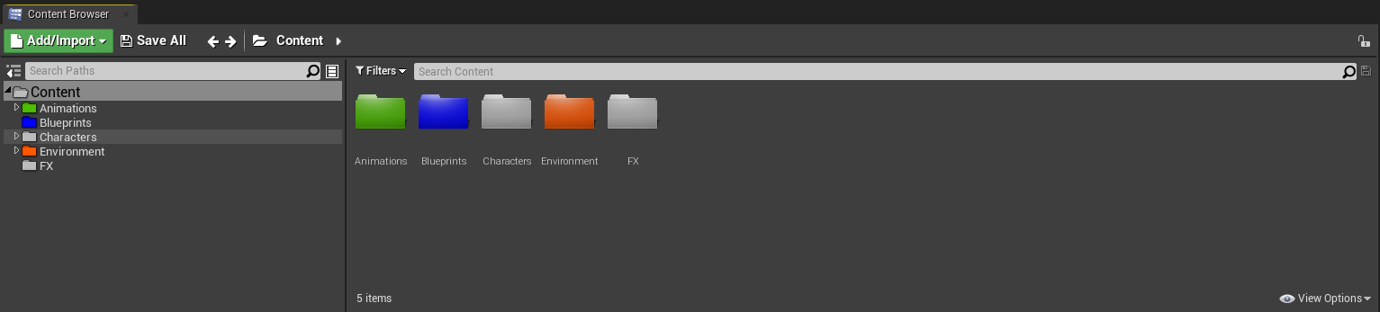 The content browser is where you keep all of your assets, blueprints, animations, and so on. This is similar to a file explorer in windows but for our project.