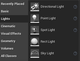 In Unreal Engine 4, there are five different types of lighting. You can find them in the Place Actors window.