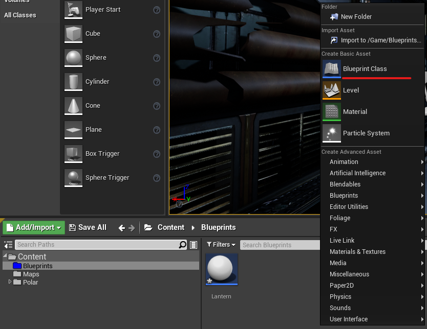 1. Then, in the content browser, right-click to create a blueprint.