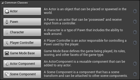 There are numerous types of pre-built blueprints. However, there are seven that are frequently used. When you create Blueprints, you can choose from common classes and get a brief description. The main blueprint is Actor, which is essentially an empty object.