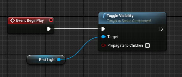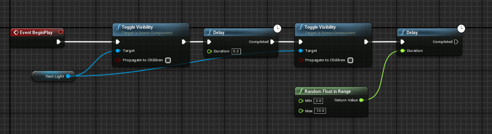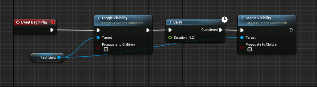 2. Now, let's add delay and re-enable it. To turn it back on, create a new Delay node and ToggleVisibility again. To copy and paste nodes, use Ctrl+c and Ctrl+v. Don't forget to select a toggle target (Rect Light).