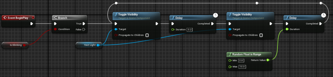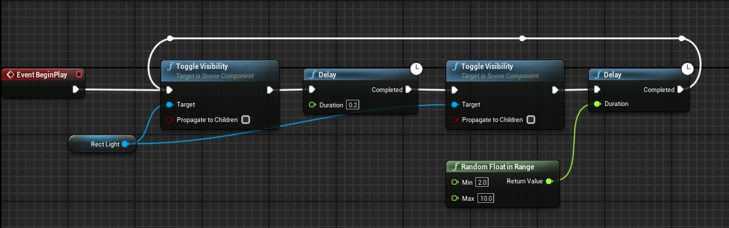 4. Let's make a loop because it will stop working after the first on/off. The white line in the editor represents the flow of your logic. When the last delay is completed, we need to go back to the beginning. A very simple way to do this is to drag a white line into the first ToglleVisibility node again. (You can double click the lines to add more points.) After compiling, your light will blink randomly.