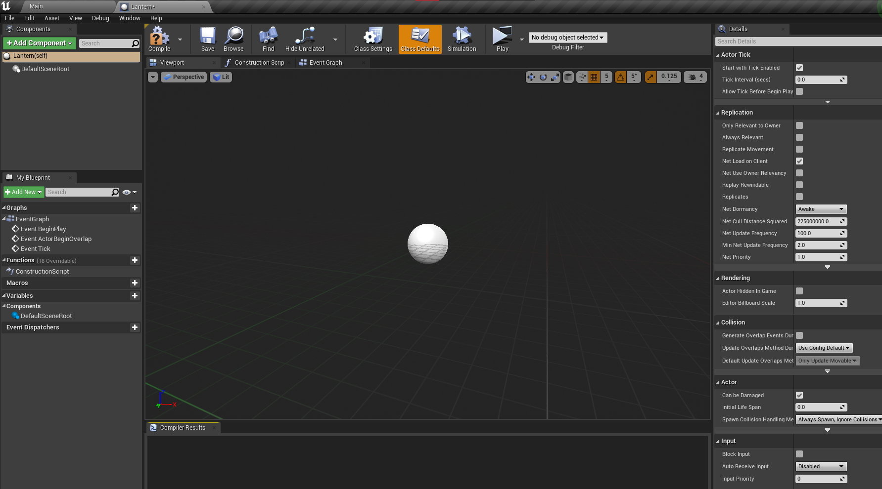 Your object's visual representation can be seen in the viewport. You can also write logic in the event graph. You can add various components to your object in the components window (pre-made or your own). You can create variables and functions for your blueprints in My Blueprint window. In the Details panel, you can also change the settings of various components. Let us now make our lantern.
