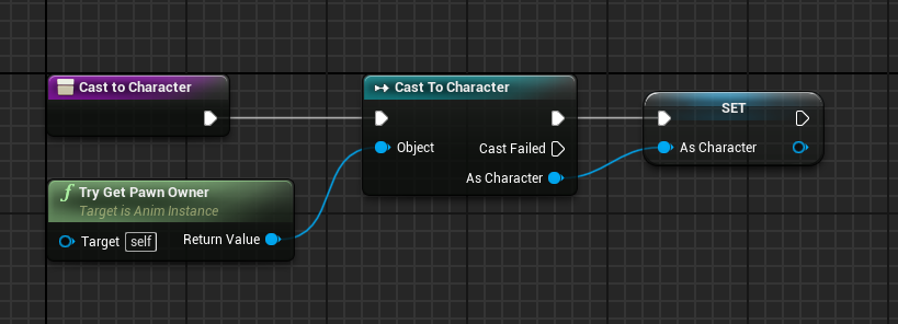 4. Let's now assign some values to our variables. We'll get those from our player and use them later in our animation logic. Open the CastToPlayer function you created and let's get the player. This function will attempt to retrieve the player pawn from where those arms are placed. They are placed in the FirstPersonCharacter blueprint in our case, so it will get this and set it to a separate variable. Try Get the Pawn Owner > Cast as a Character > Promote to Variable CastedCharacter is the name given to this new variable.