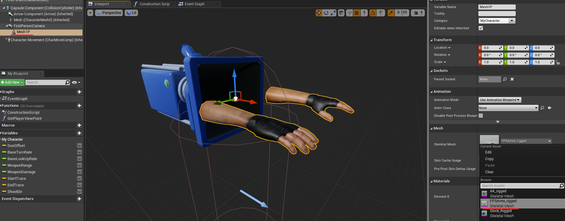 1. Let's get our arms in a good position. Open your FPS_Character blueprint and select your arms in the Mesh1P component under the Mesh section. Then position them in front of the camera.