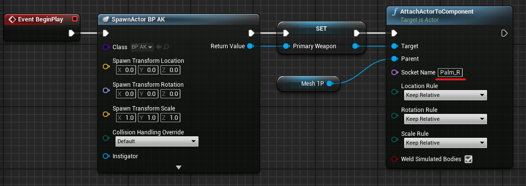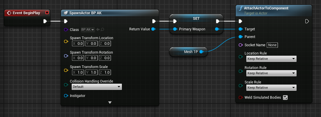 6. Let us now put our weapon into action. Create an event BeginPlay node in the FirstPersonCharacter Event Graph. Create a SpawnActor Node and select our AK Blueprint (Also right click on Spawn transform and Split struct pin). Then drag and promote the return value to variable (name it primary weapon). After that, attach an actor to a component node, set the target to primary weapon, and set the parent to Mesh1P.