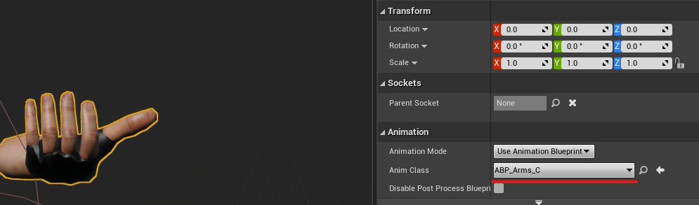 7. Now we must select the socket to which our weapon will be attached. Palm_R is the name of socket in our arms, and you must set the exact name. Compile and save your work after that.