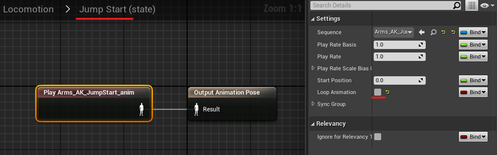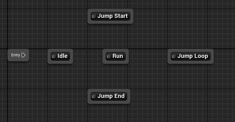 7. Launch Locomotion. Here we will create the flow of our animation. Drag and drop arms AK animations from the asset browser (idle, run, jump loop, jump start and end). You can rename them as well.