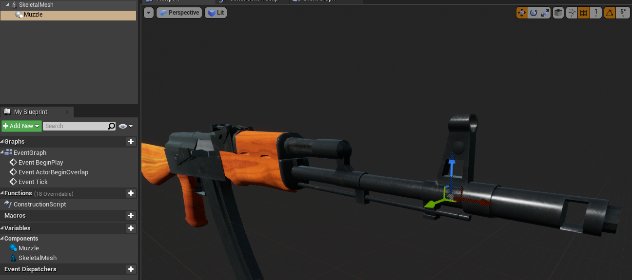 2. Make a scene component called muzzle. Attach it to the AK muzzle. We'll spawn bullets from there later.