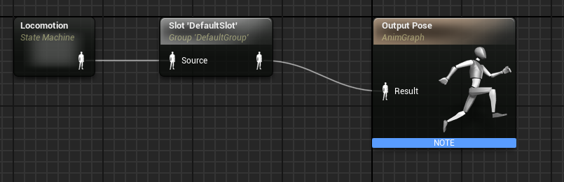6. Let us now construct a state machine. The state machine will check the player's current state and play a specific animation based on that. Create a state machine node in the Animation graph (Add new state machine and name it Locomotion). Then we need to play in the Default animation slot (we don't need any slots for this course, but we do need to play it through the slot for it to work). Connect the result to the default slot node.
