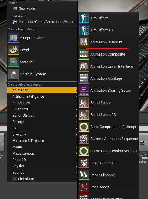 2. Let's make an animation blueprint. This blueprint contains all of the animation logic for specific objects, such as our arms. Create an Animation blueprint in the Arms Animations folder and select our Arms skeleton. Call it ABP_Arms or something similar.