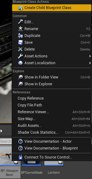 5. Create a child blueprint dependent on our base. When you have a lot of game objects with similar properties, such as weapons, a parent blueprint comes in handy. Because every weapon has MaxAmmo, etc., you don't need to rewrite it for every gun you make in game; simply inherit from the parent blueprint.