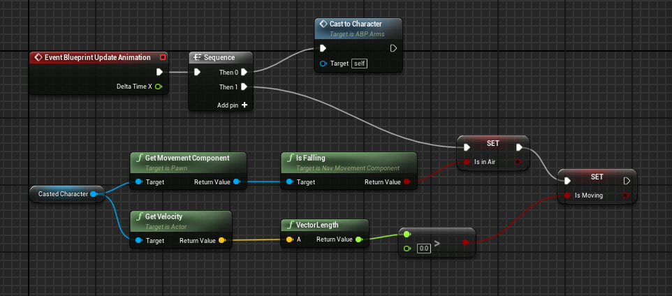 5. Let us now update our variables. Launch Event Graph. You will notice an Animation Update Event, which occurs many times in a single second. From here, we'll create a sequence and assign values based on our player. We get the Movement Component and its IsFalling Boolean (true, false) from our casted character and set it to our IsInAir variable. Also, we get our player's velocity and check whether its vector is greater than 0 (indicating that it is moving) before setting it back to our variable.